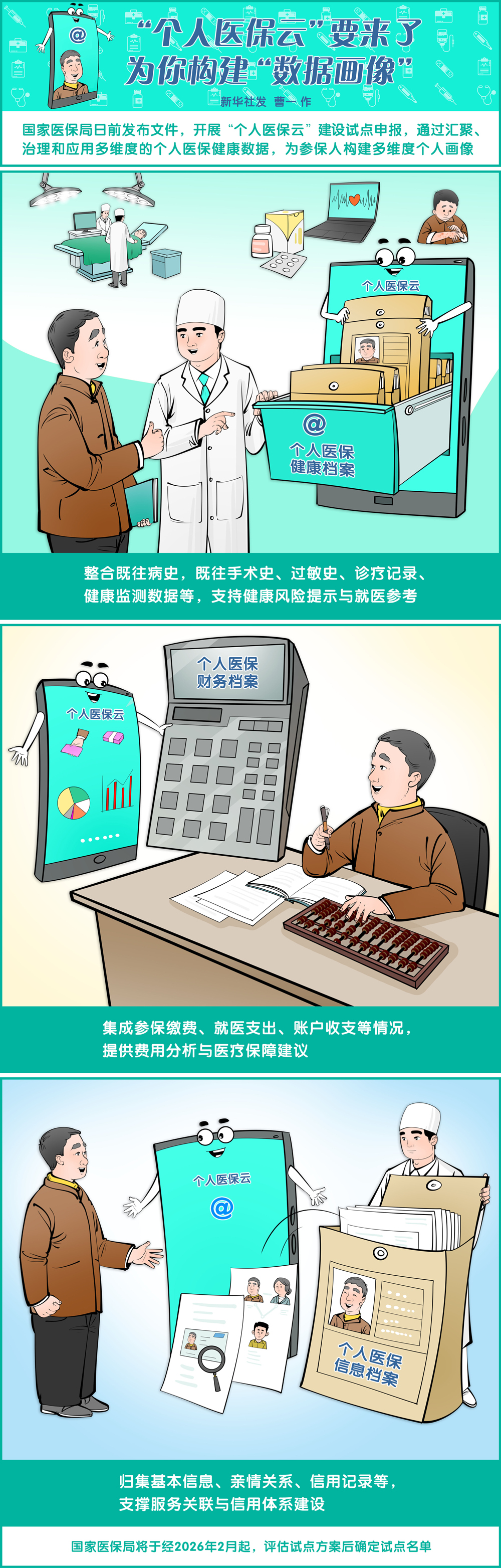 新华社发 曹一 作 国家医保局日前发布文件,开展“个人医保云”建设试点申报,通过汇聚、治理和应用多维度的个人医保健康数据,绘制个人医保画像,探索构建覆盖全人群、全周期、全场景的智慧医保管理新范式。